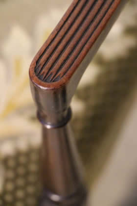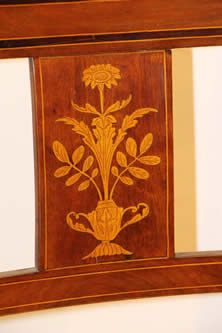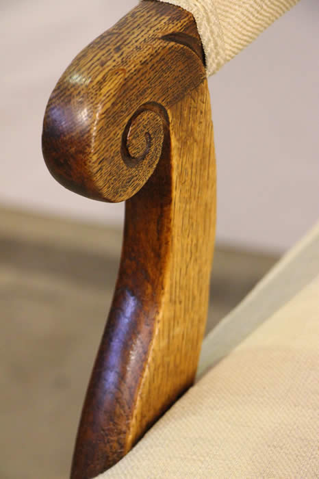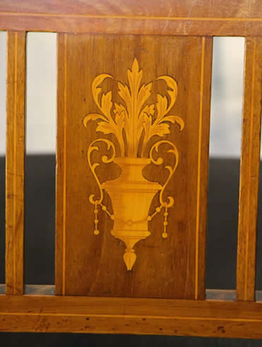 the other with string inlay in birch and ebony. the shaped armrests supported on