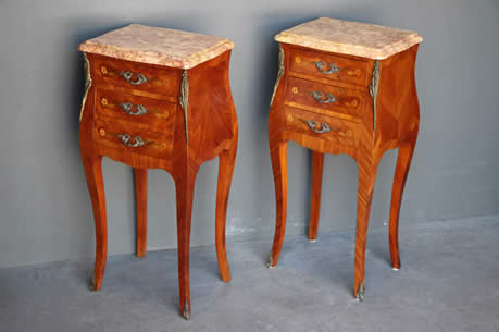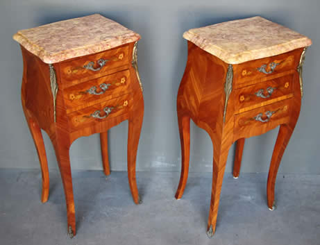| Title Pair French Louis XV tulip wood marquetry 3 drawer bedside chests with marble tops