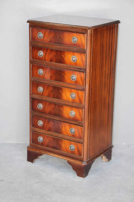 In the Georgian manner of 1800 this UK made tall chest is ideal as a bedside cabinet or pier chest. Each drawer with two ornate brass ring pull handles and in good polished condition.