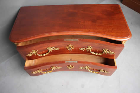 Three graduated size drawers with concave fronts bronze keyhole escutcheons and ornate handles. These are flanked by fluted column pilasters to each side.