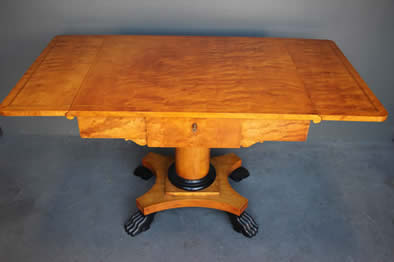 Original l polished blonde mahogany top with two drop side extensions over a two fulll depth drawers with turned empire bronze knobs and ormolu escutcheons. A working key is supplied. All actions work smoothly and have been serviced. The drop sides hinge up and are supported from underneath with pull out rails.