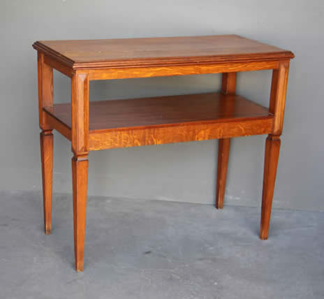 Ideal as a centre table, or lamp table or even as a very bedside table. Made in solid american oak . Original patina polish. Some marks to surface consistent with age and use. Polished all round so it can stand in the centre of a room.