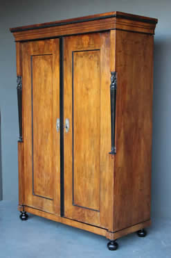 The doors with raised panels and brass handles flanked by turned fruitwood columns.