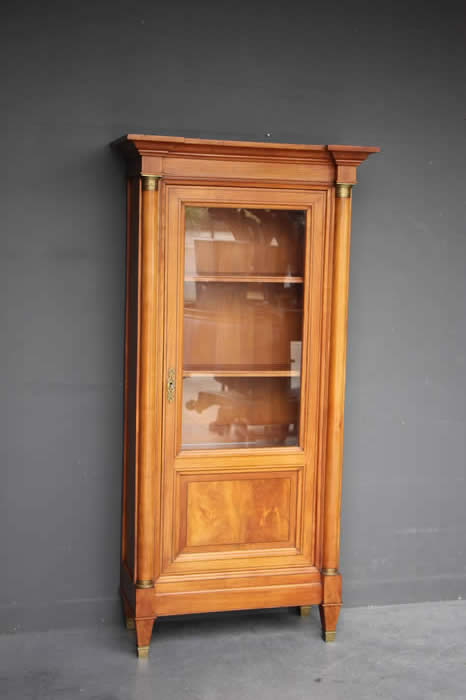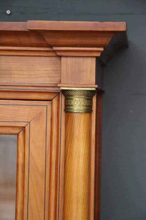 Title  Antique French Empire glazed bookcase in blonde cherrywood ebony inlay bronze column mounts 1890