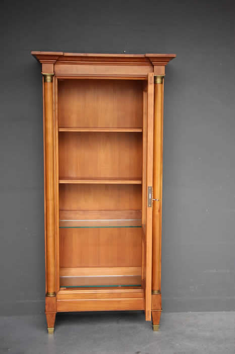 Antique French Empire glazed cabinet bookcase in solid blonde cherrywood with ebony string inlay and bronze column mounts in the manner of Charles X circa 1890