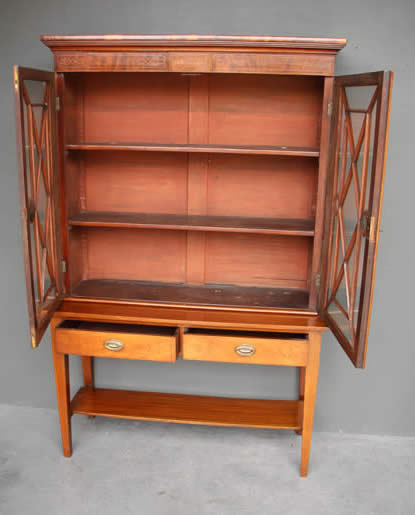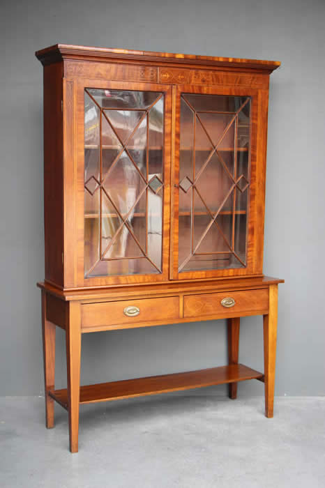 The stepped top with ornate Regency inlay over two glazed doors featuring original hand drawn glass panes.