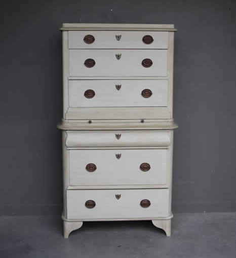 Title   Antique Danish Biedermeier tallboy chest on chest of drawers painted finish with secret compartment 1840