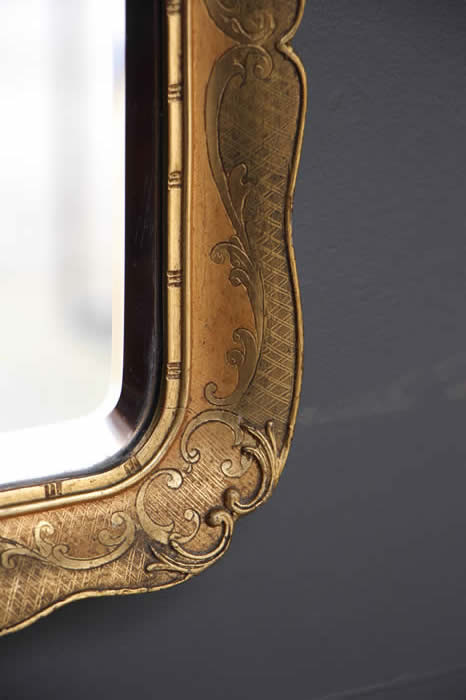 This mirror also retains the original mirror glasses. Note that the mirror glass was usually far more expensive in its time than the ornate wooden frame that surrounds it.