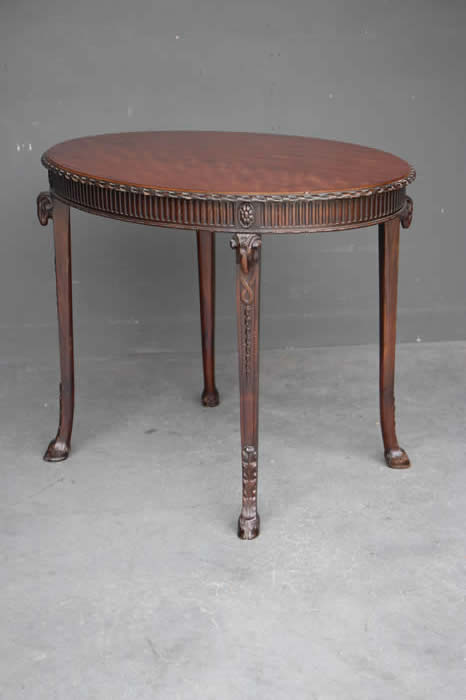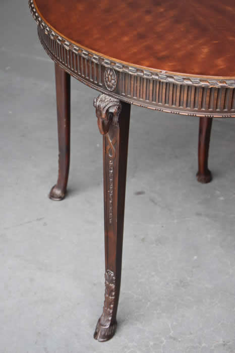 Description Gorgeous mahogany centre or lamp table in flame mahogany top with carved border. In the English Regency manner this Scandinavian mahogany round centre table raised on carved reeded column to platform base and curved scroll feet. Ideal as use for a games table, lamp or bedside table. Polished all round. Beautiful quality craftsmanship with superb selection of timbers.