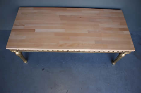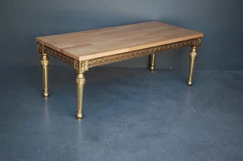 | Title Solid French oak top coffee table on carvedcolumns with platform base hand painted gilt patina 1960s | |