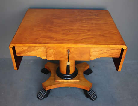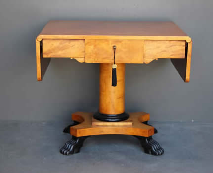 Original l polished blonde mahogany top with two drop side extensions over a two fulll depth drawers with turned empire bronze knobs and ormolu escutcheons. A working key is supplied. All actions work smoothly and have been serviced. The drop sides hinge up and are supported from underneath with pull out rails.