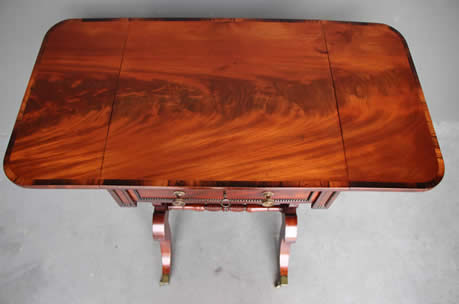 Description Antique Empire sofa table writing desk raised on four sturdy turned columns to sabre legs and 2 drawers.
